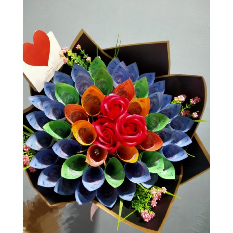 Bukan sahaja sembilan kuntum bunga ros merah hati segar tetapi wang kertas rm50 sebanyak 12 keping turut digubah menjadi jambangan duit yang jambangan bunga duit. Jambangan bunga yang dihiasi dengan kepingan duit kini kerap kali dipilih menjadi hadiah untuk diberikan kepada orang tersayang.